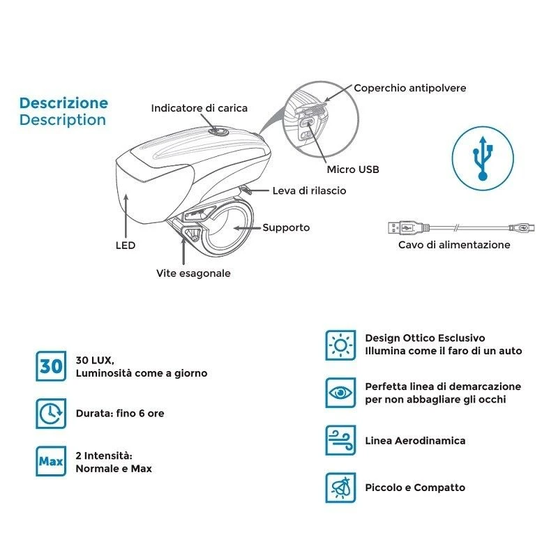 - Luce anteriore: 30 LUX, Luminosità come a giorno