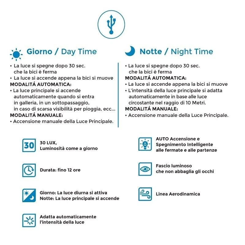 - Luce anteriore: 30 LUX, Luminosità come a giorno